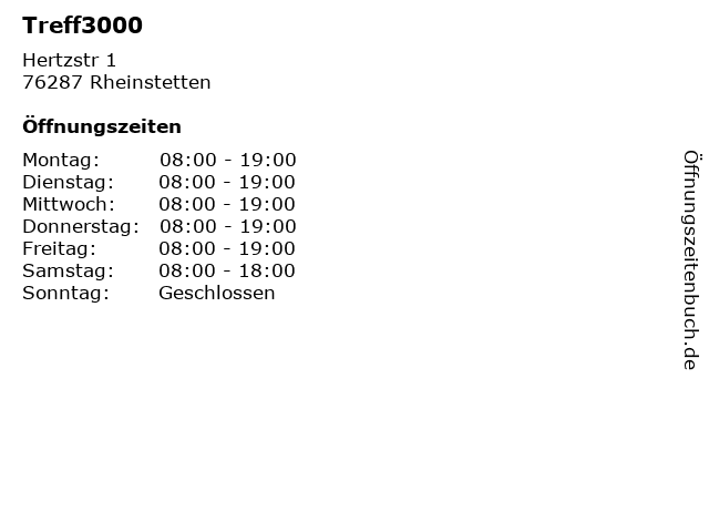 | Öffnungszeiten Treff3000 in Rheinstetten anzeigen | |