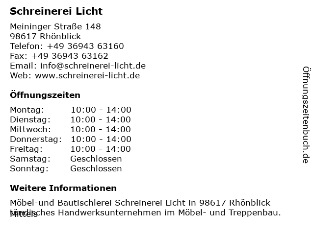 | Öffnungszeiten Schreinerei Licht in Rhönblick anzeigen | |