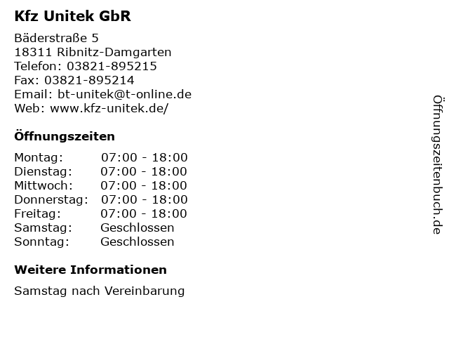 | Öffnungszeiten Kfz Unitek GbR in Ribnitz-Damgarten anzeigen | |