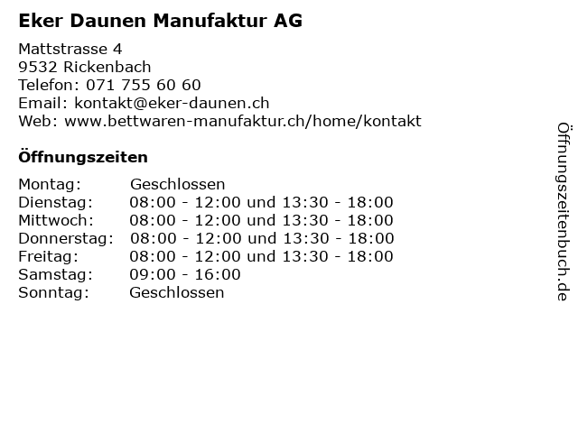 | Öffnungszeiten Eker Daunen Manufaktur AG in Rickenbach anzeigen | |