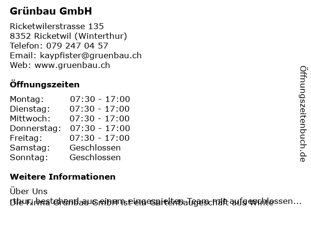 | Öffnungszeiten Grünbau GmbH in Ricketwil (Winterthur) anzeigen | |