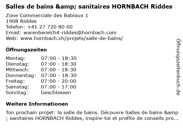 1 Matériaux de construction HORNBACH Riddes (Entfernung: 0,00 km) Zone Commerciale des Babioux 1, 1908 Riddes 5 Les Bains de Saillon | Wellness-Maiensässe (Entfernung: 1,44 km) Route du Ctre Thermal 16, 1913 Saillon 6 |