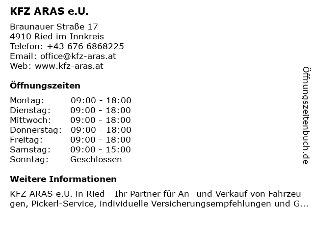 | Öffnungszeiten KFZ ARAS e.U. in Ried im Innkreis anzeigen | |
