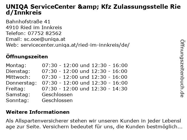1 UNIQA ServiceCenter & Kfz Zulassungsstelle Ried/Innkreis (Entfernung: 0,00 km) Bahnhofstraße 41, 4910 Ried im Innkreis 2 UNIQA Versicherungen AG - Bezirksdisponent Peter Dallinger (Kontakt & Service) (Entfernung: 0,00 km) Bahnhofstraße 41, 4910 Ried/Innkreis 3 UNIQA Versicherungen AG - ServiceCenter Ried/Innkreis (Beratung | Service | KFZ-Zulassung) (Entfernung: 0,00 km) Bahnhofstraße 41, 4910 Ried/Innkreis 6 |