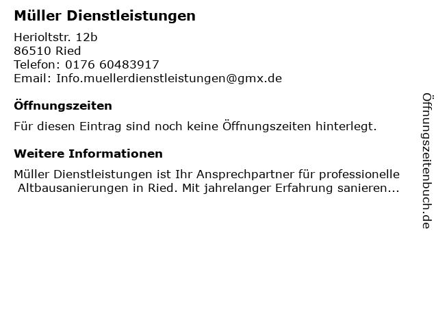 | Öffnungszeiten Müller Dienstleistungen in Ried anzeigen | |