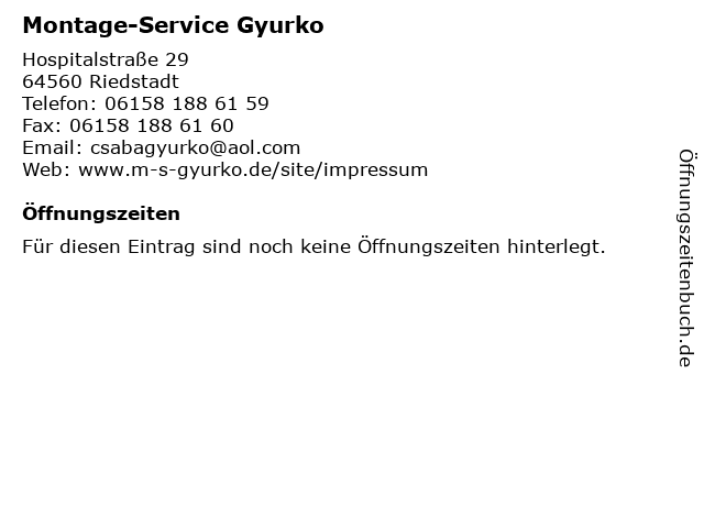 | Öffnungszeiten Montage-Service Gyurko in Riedstadt anzeigen | |