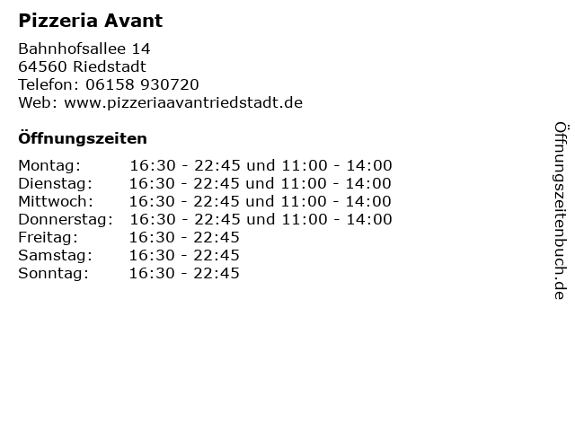 | Öffnungszeiten Pizzeria Avant in Riedstadt anzeigen | |