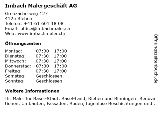 | Öffnungszeiten Imbach Malergeschäft AG in Riehen anzeigen | |
