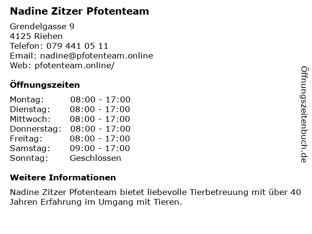 | Öffnungszeiten Nadine Zitzer Pfotenteam in Riehen anzeigen | |