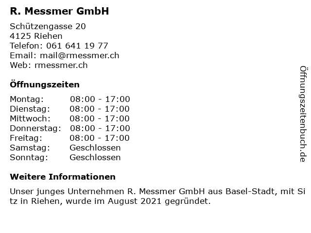 | Öffnungszeiten R. Messmer GmbH in Riehen anzeigen | |