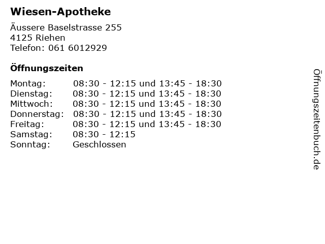 | Öffnungszeiten Wiesen-Apotheke in Riehen anzeigen | |