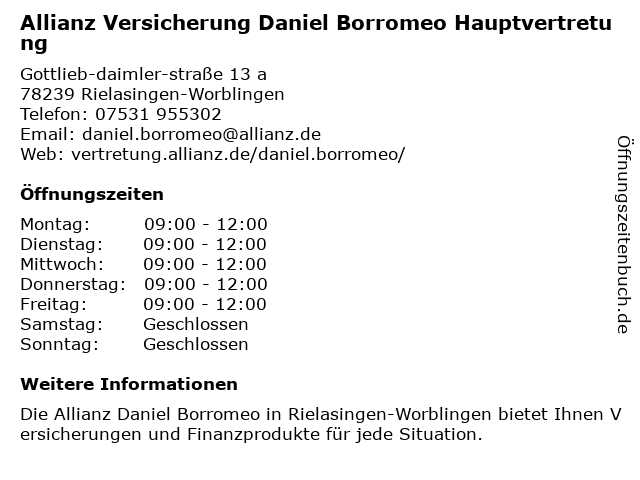 1 Allianz Versicherung Dominik Lemberger Hauptvertretung (Entfernung: 0,62 km) Hegaustraße 2, 78239 Rielasingen-Worblingen 2 Daniel Borromeo Generalagent ARAG (Entfernung: 1,38 km) In der Breite 3, 78239 Rielasingen-Worblingen 6 Kleintierchirurgie AG, Dr. med. vet. Daniel Koch (Entfernung: 9,03 km) Ziegeleistrasse 5, 8253 Diessenhofen |
