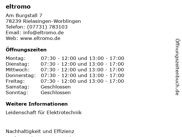 | Öffnungszeiten eltromo in Rielasingen-Worblingen anzeigen | |