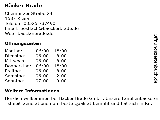 | Öffnungszeiten Bäcker Brade in Riesa anzeigen | |