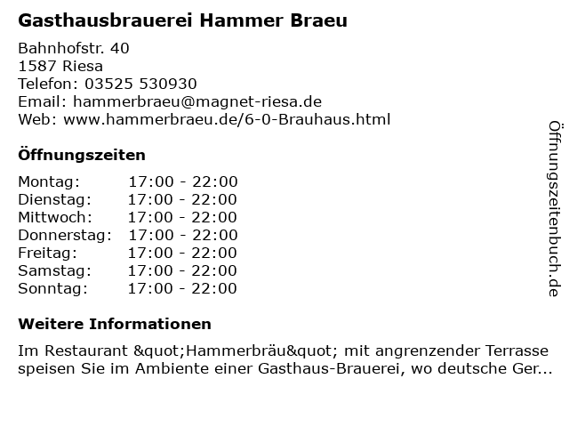 | Öffnungszeiten Gasthausbrauerei Hammer Braeu in Riesa anzeigen | |