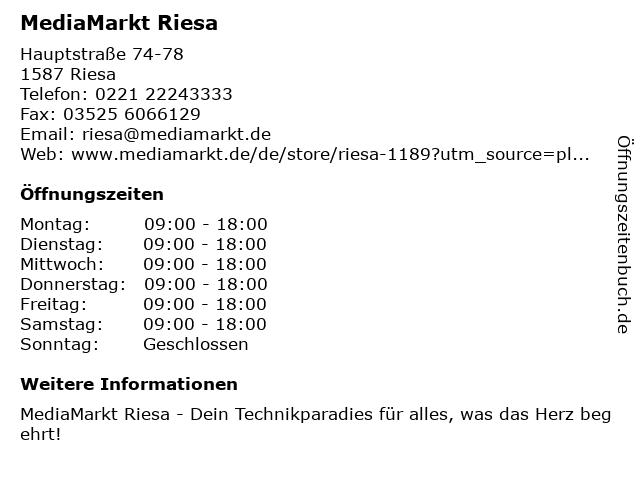 | Öffnungszeiten MediaMarkt Riesa in Riesa anzeigen | |