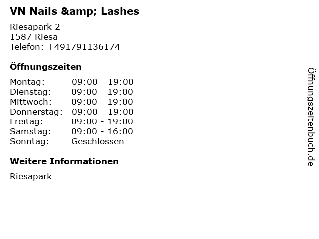 | Öffnungszeiten VN Nails & Lashes in Riesa anzeigen | |