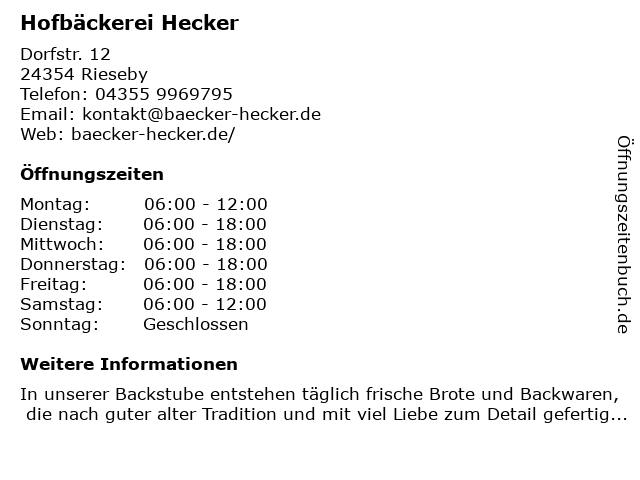 | Öffnungszeiten Hofbäckerei Hecker in Rieseby anzeigen | |