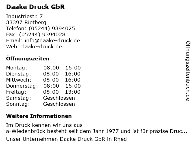 | Öffnungszeiten Daake Druck GbR in Rietberg anzeigen | |