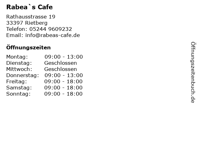 | Öffnungszeiten Rabea`s Cafe in Rietberg anzeigen | |