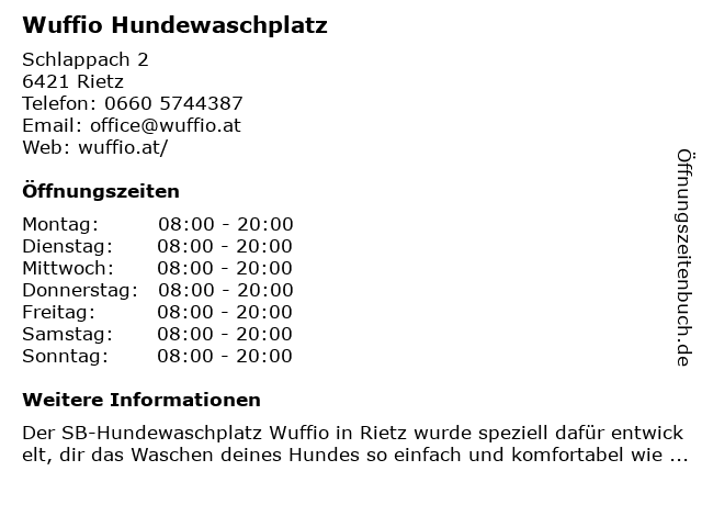| Öffnungszeiten Wuffio Hundewaschplatz in Rietz anzeigen | |