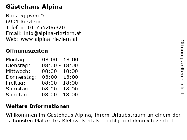 | Öffnungszeiten Gästehaus Alpina in Riezlern anzeigen | |