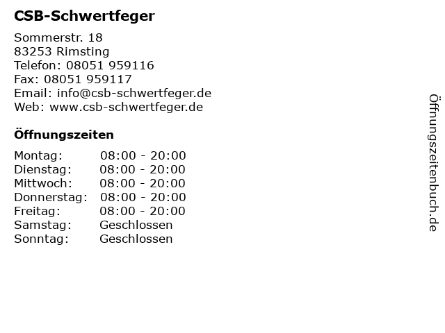 | Öffnungszeiten CSB-Schwertfeger in Rimsting anzeigen | |