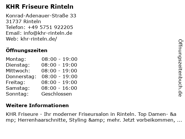 | Öffnungszeiten KHR Friseure Rinteln in Rinteln anzeigen | |