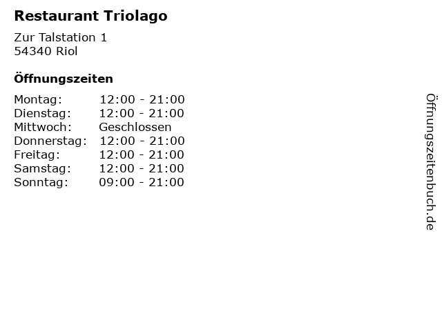 | Öffnungszeiten Restaurant Triolago in Riol anzeigen | |