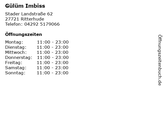 | Öffnungszeiten Gülüm Imbiss in Ritterhude anzeigen | |