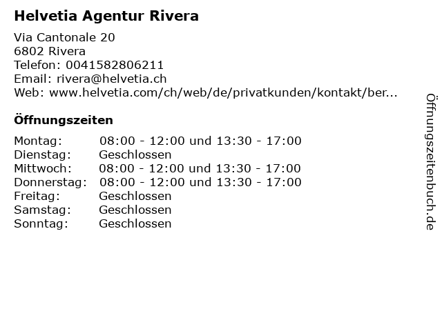 | Öffnungszeiten Helvetia Agentur Rivera in Rivera anzeigen | |