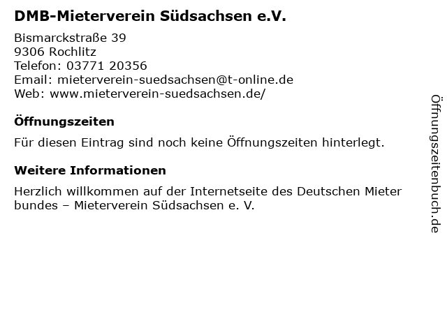 2 DMB-Mieterverein Südsachsen e.V. (Entfernung: 14,91 km) Straße Der Deutschen Einheit 7, 09217 Burgstädt 6 |