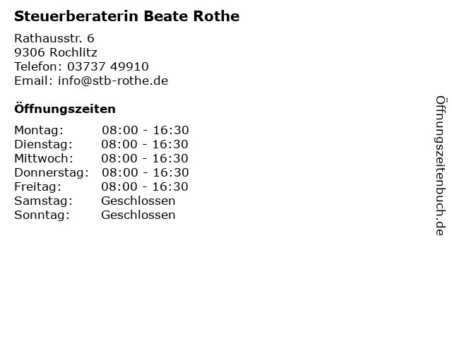 | Öffnungszeiten Steuerberaterin Beate Rothe in Rochlitz anzeigen | |