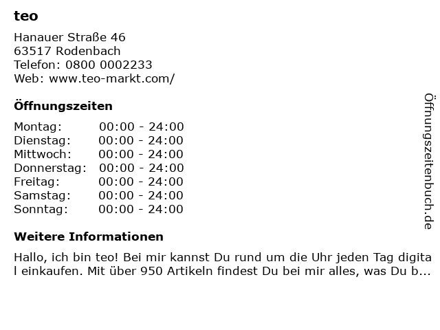 | Öffnungszeiten teo in Rodenbach anzeigen | |