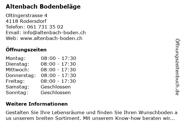 | Öffnungszeiten Altenbach Bodenbeläge in Rodersdorf anzeigen | |