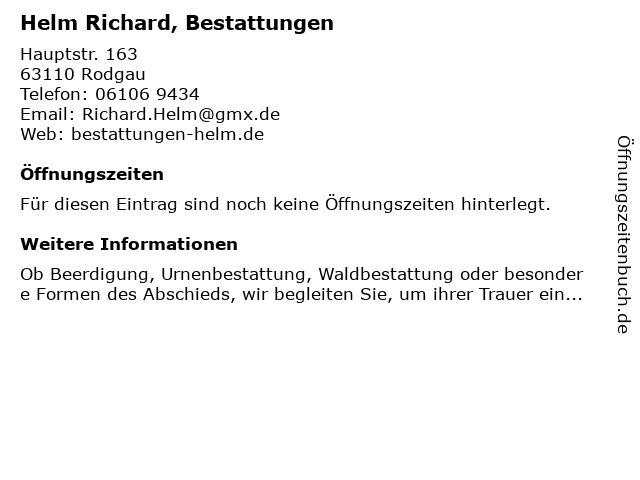 | Öffnungszeiten Helm Richard, Bestattungen in Rodgau anzeigen | |