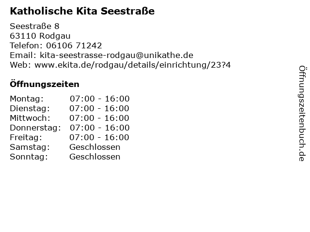 | Öffnungszeiten Katholische Kita Seestraße in Rodgau anzeigen | |