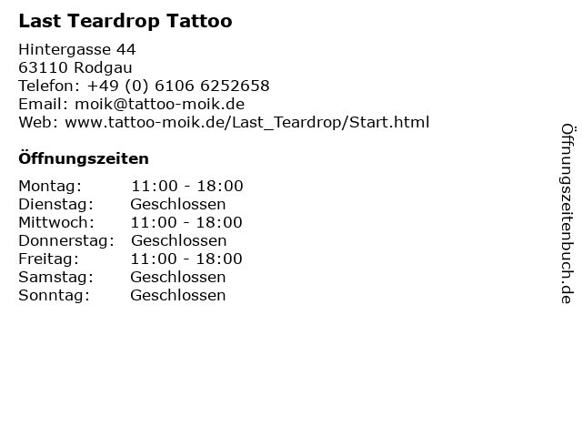 | Öffnungszeiten Last Teardrop Tattoo in Rodgau anzeigen | |