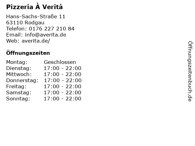 | Öffnungszeiten Pizzeria À Verità in Rodgau anzeigen | |