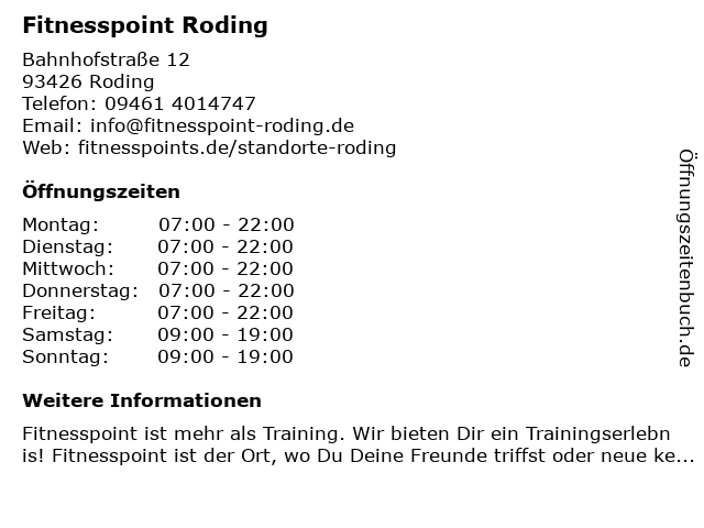 | Öffnungszeiten Fitnesspoint Roding in Roding anzeigen | |