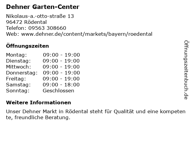 | Öffnungszeiten Dehner Garten-Center in Rödental anzeigen | |