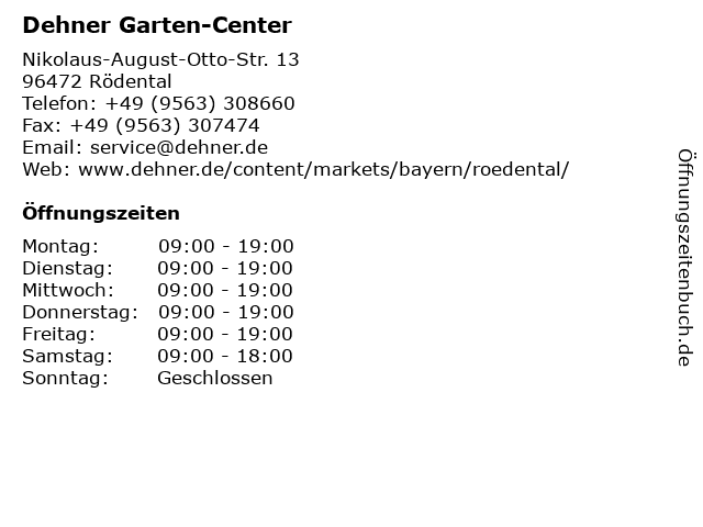 | Öffnungszeiten Dehner Garten-Center in Rödental anzeigen | |