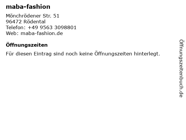 | Öffnungszeiten maba-fashion in Rödental anzeigen | |