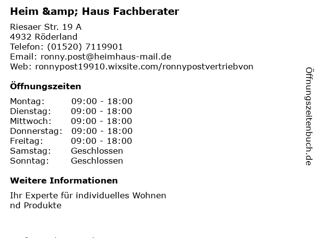 | Öffnungszeiten Heim & Haus Fachberater in Röderland anzeigen | |