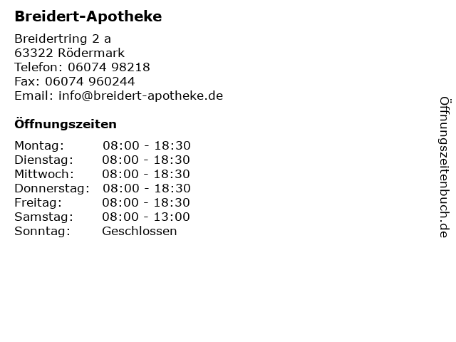 | Öffnungszeiten Breidert-Apotheke in Rödermark anzeigen | |
