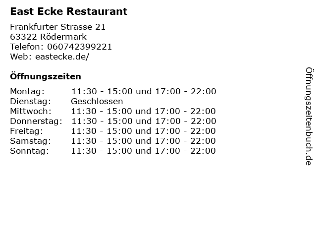 | Öffnungszeiten East Ecke Restaurant in Rödermark anzeigen | |