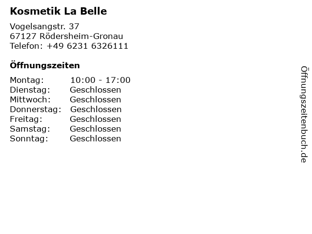 | Öffnungszeiten Kosmetik La Belle in Rödersheim-Gronau anzeigen | |