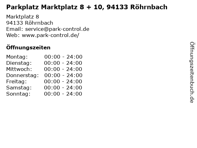 | Öffnungszeiten Parkplatz Marktplatz 8 + 10, 94133 Röhrnbach in Röhrnbach anzeigen | |