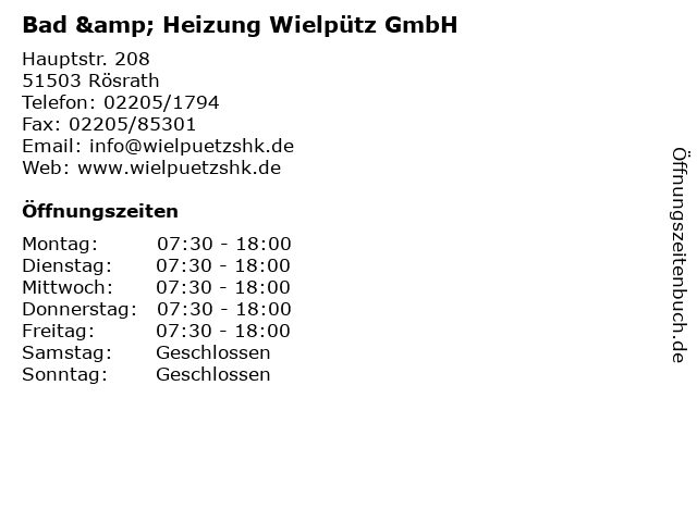 | Öffnungszeiten Bad & Heizung Wielpütz GmbH in Rösrath anzeigen | |