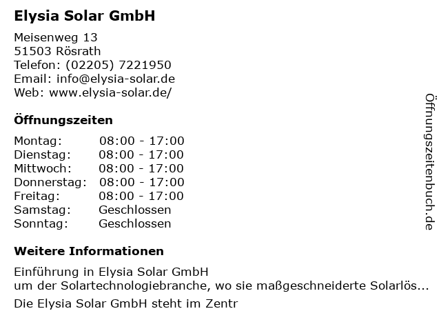 | Öffnungszeiten Elysia Solar GmbH in Rösrath anzeigen | |